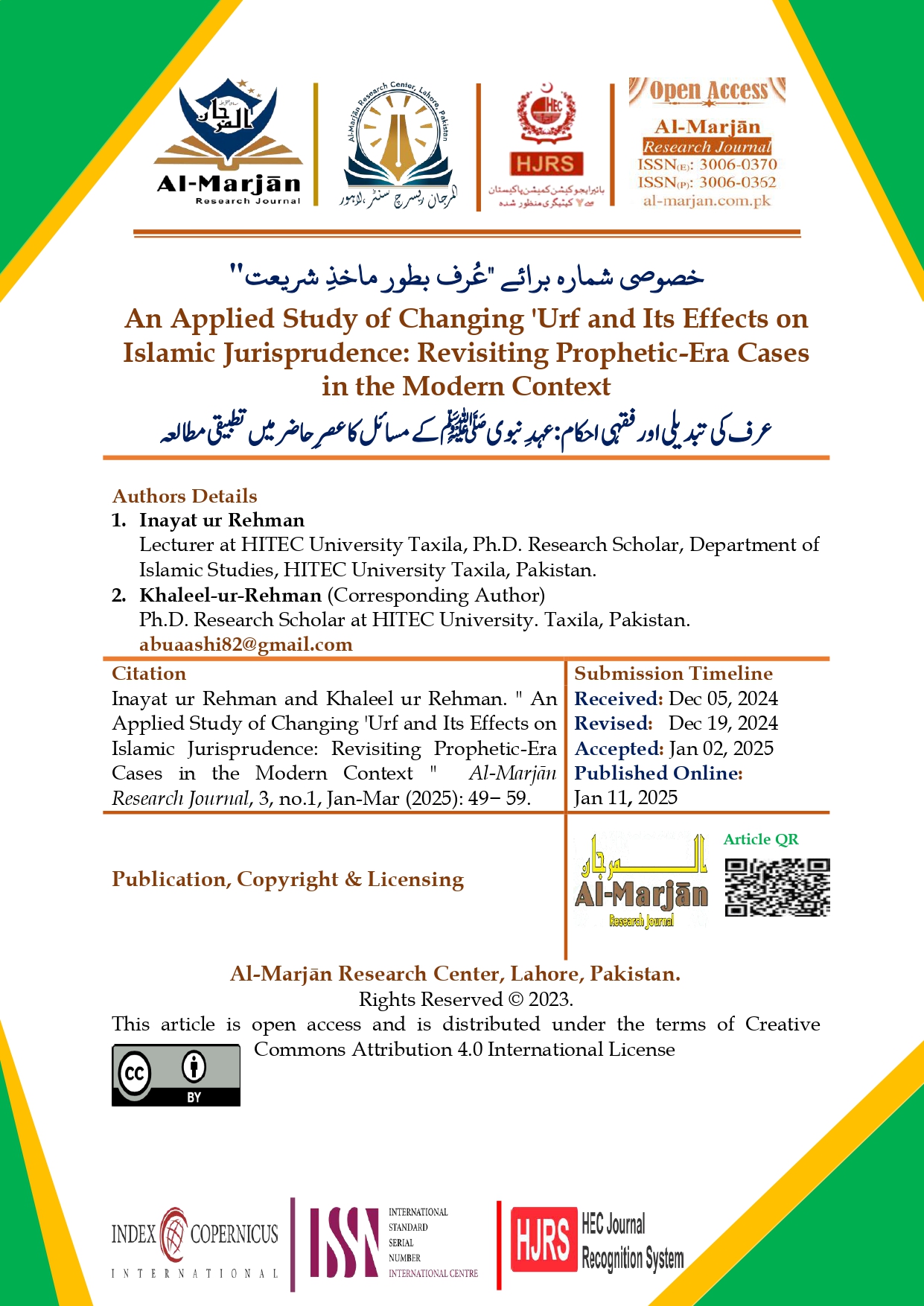 In Islamic jurisprudence, ‘Urf (custom) holds significant importance as a principle that aids in the application of legal rulings in accordance with time and circumstances. During the era of Prophet Muhammad ﷺ, many rulings were established based on the prevailing customs of that time. However, with the evolution of customs, the nature of these rulings also changed. This study examines the legal issues that were determined based on ‘Urf during the Prophet’s time and analyzes how their status has transformed in the modern era due to shifts in customary practices. This research will be conducted in light of the jurisprudential maxim "Al-‘Ādah Muhakkamah" (Custom is authoritative) and will present the views of classical and contemporary scholars on the subject. A key focus will be on determining whether every ruling based on ‘Urf is subject to change over time or if certain rulings, despite being linked to a specific custom, retain their permanency due to fundamental Shari'ah principles. This paper offers an analytical and applied study of the transformation of ‘Urf and its impact on Islamic legal rulings, providing a deeper understanding of the evolutionary nature of Islamic jurisprudence and its practical application in contemporary times.